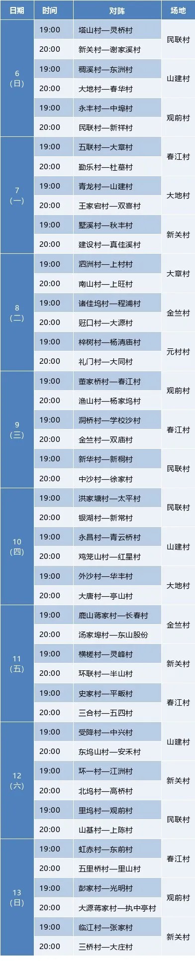Konkurrencen blev afholdt i ni konkurrencezoner: Minlian Village i Dongzhou Subdistrict; Dadi Village, Jinzhu Village og Guanqian Village (Zhougongwu) i Yinhu Subdistrict; Chunjiang Village og Shanjian Village i Chunjiang Subdistrict; Yuan Village i Xindeng Town; Changlv Town Basketball Hall; og Xinguan Village i Dayuan Town . I år vil endnu flere være i stand til at se de spændende spil lige uden for døren.
